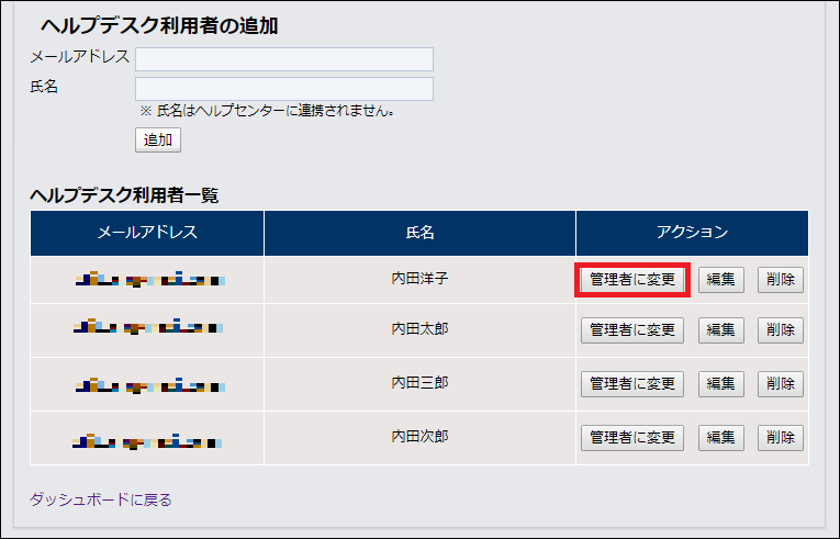 管理者とヘルプデスク利用者は、同じメールアドレスでアカウント登録を行うことができません。ヘルプデスク利用者を管理者に変更したい場合は、「ヘルプデスク利用者から管理者への変更」を参照してください。管理者からヘルプデスク利用者への変更はできません。注釈