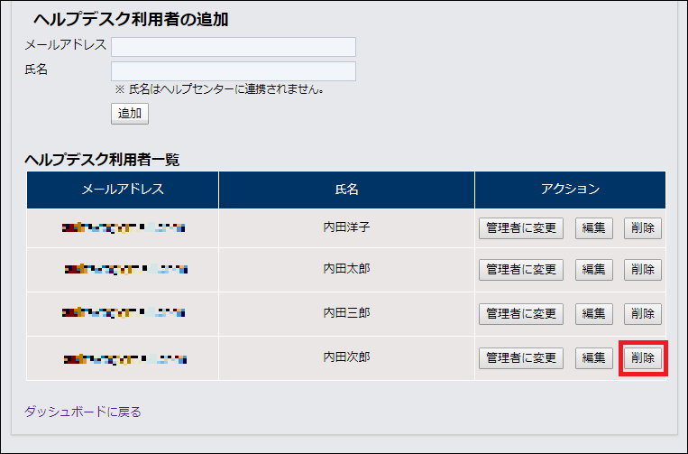 ヘルプデスク利用者一覧で該当アカウントの[削除]をクリックします。