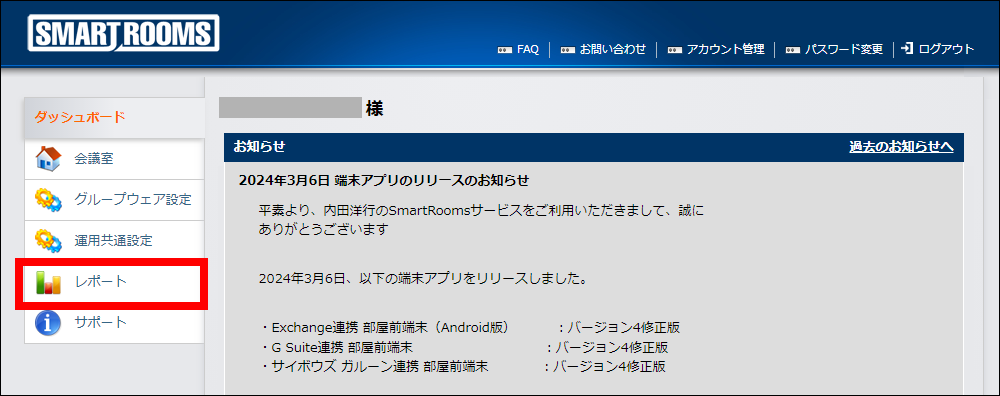 ログイン方法については、「 通常のログイン 」を参照してください。→ ダッシュボード画面が表示されます。「 レポート 」タブをクリックします。