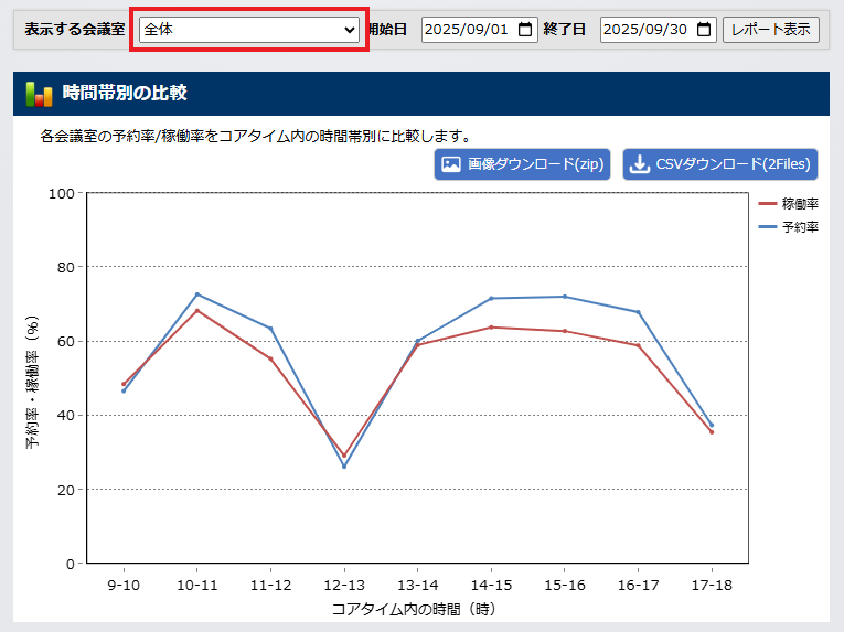 「時間帯別の比較」では、コアタイム内の時間で、1時間ごとの予約率と稼働率を表示できます。すべての会議室の平均値、または会議室ごとの値をそれぞれ表示できます。また、表示する期間を選択できます。