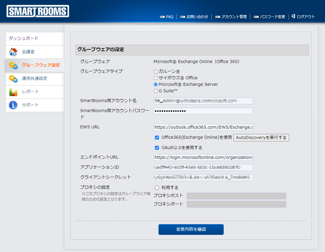 管理者用ウェブサイトごとに発行されるSmartRoomsの契約IDとシークレット、SmartRooms管理サーバー接続のための、プロキシ情報(ホスト・ポート)を設定します。