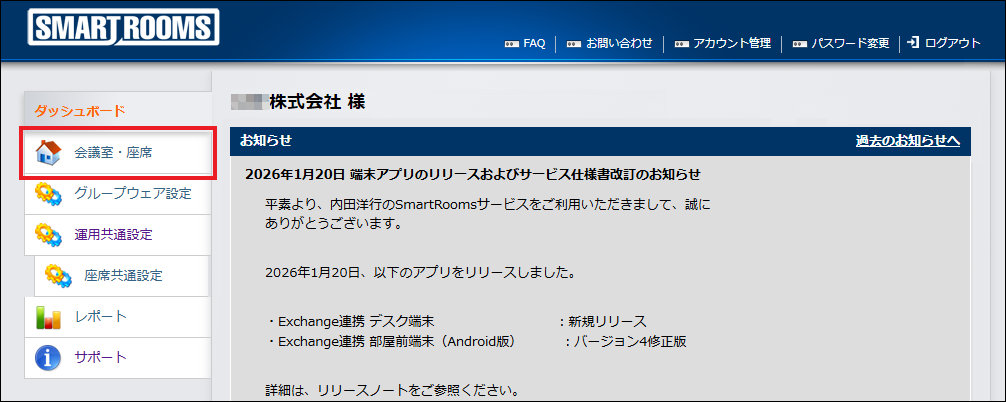 Exchangeと連携している場合のみ「会議室・座席」と表示されます。
