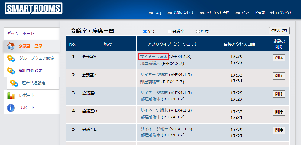 個別に設置位置を設定したい会議室のアプリタイプ(バージョン)をクリックします。