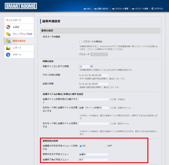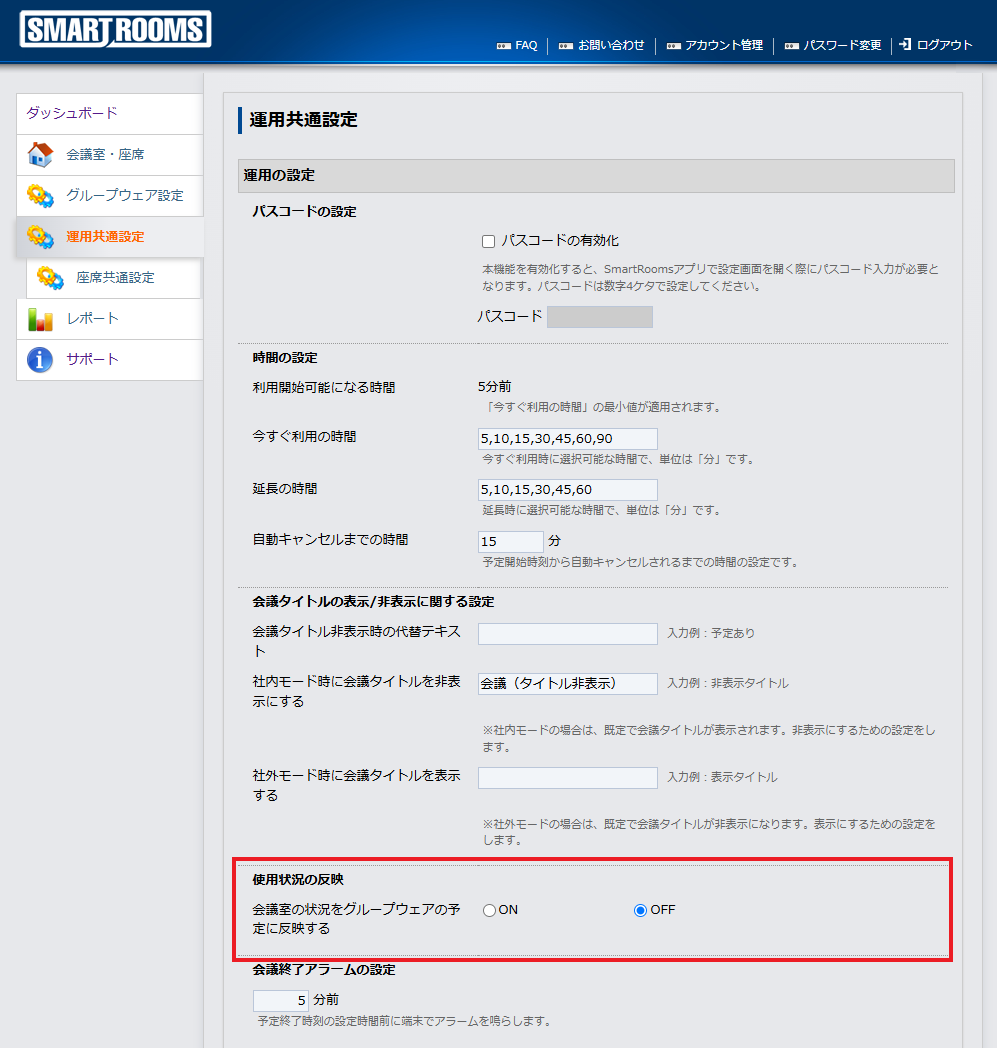 「使用状況の反映」の「会議室の状況をグループウェアの予定に反映する」をONにします。