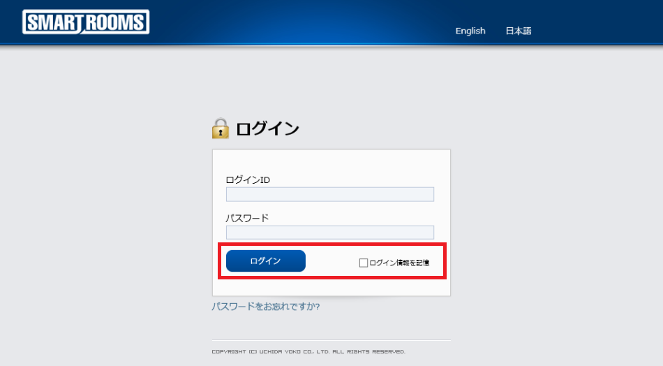 https://smartrooms.jp/customer→ ログイン画面が表示されます。「ログインID」(メールアドレス)および「パスワード」を入力します。[ログイン]をクリックします。