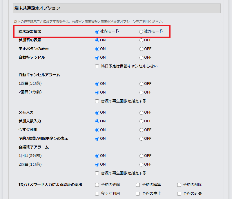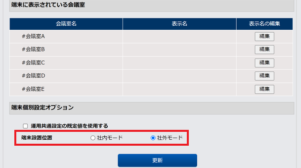 入退室管理を行っている場合の使用状況の反映や、端末設置位置(社外モード、社内モードの選択)なども、管理者用ウェブサイトで設定することができます。