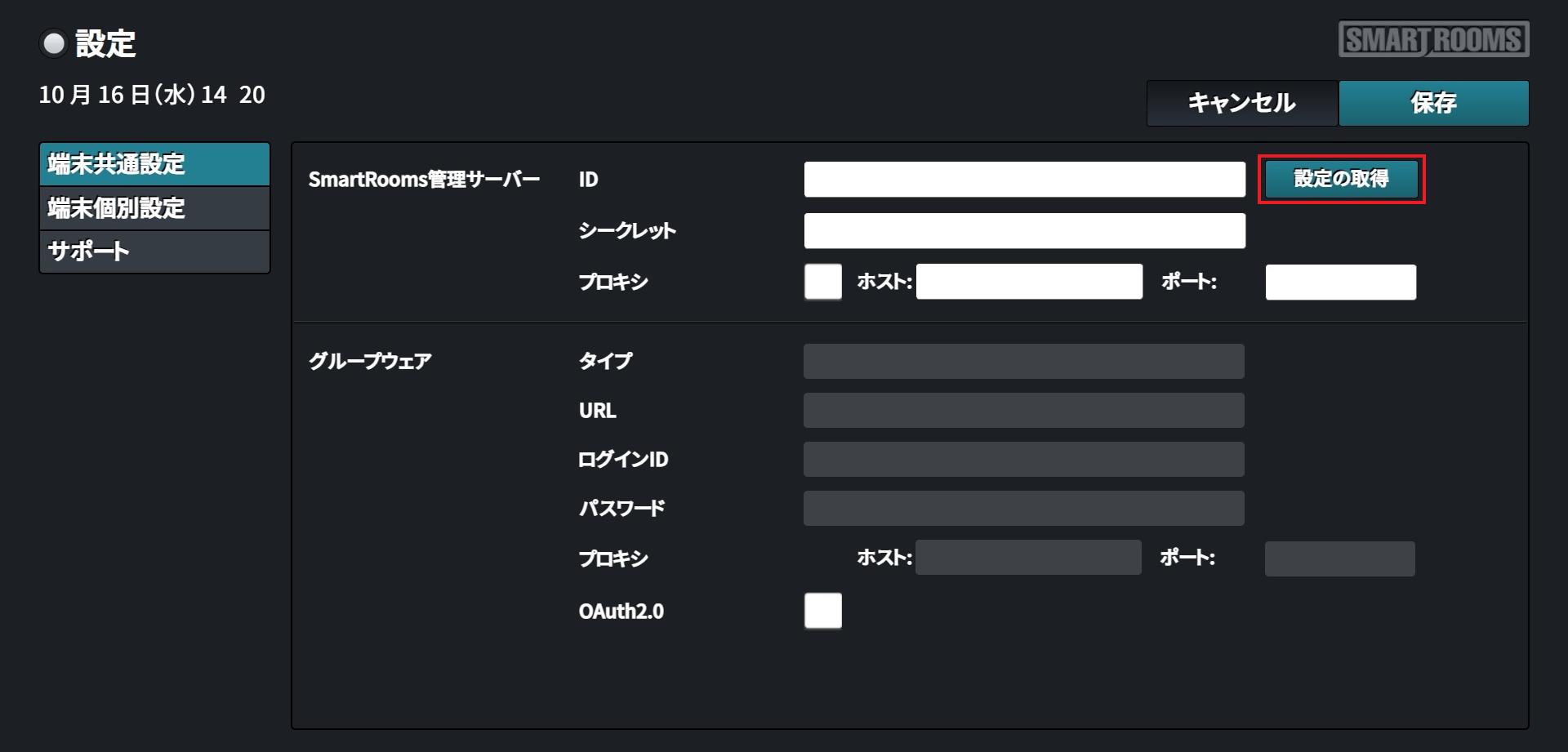 - SmartRooms管理サーバーに接続するための設定です。IDとシークレットを入力して[設定の取得]をクリックするとSmartRooms管理サーバーに接続し、管理者用ウェブサイトで設定したグループウェア接続のための情報が反映されます。