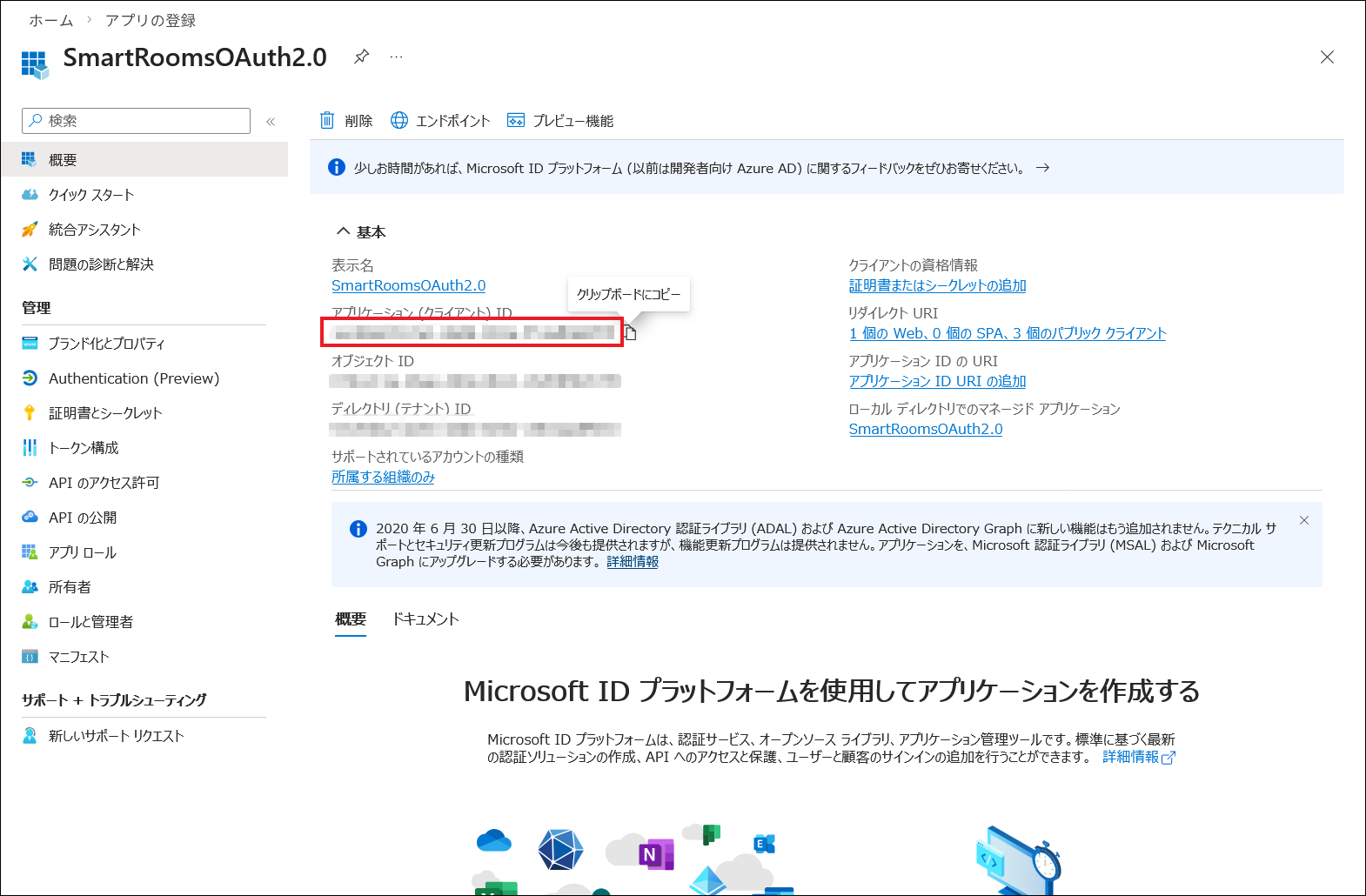 アプリケーションIDの値をコピーして保管します。