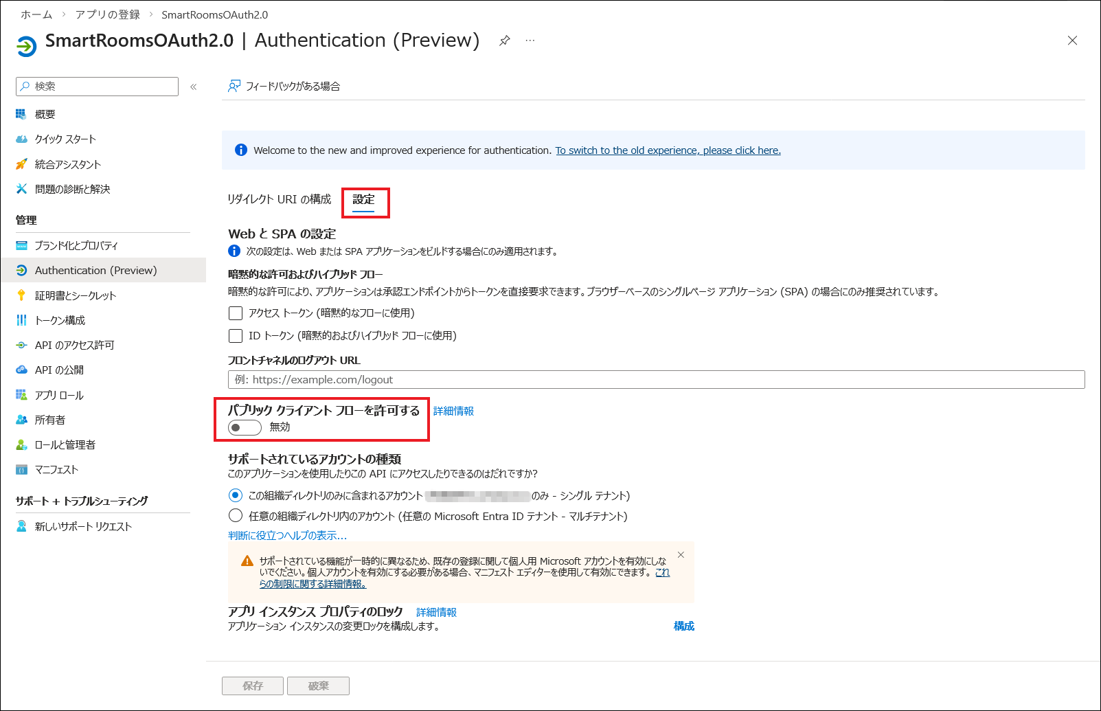 [設定]タブをクリックし、「パブリッククライアントフローを許可する」のスイッチをクリックして「有効」にします。