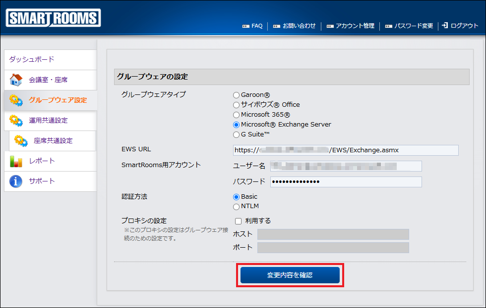 接続先グループウェアの情報は、SmartRooms管理者用ウェブサイトで設定します。