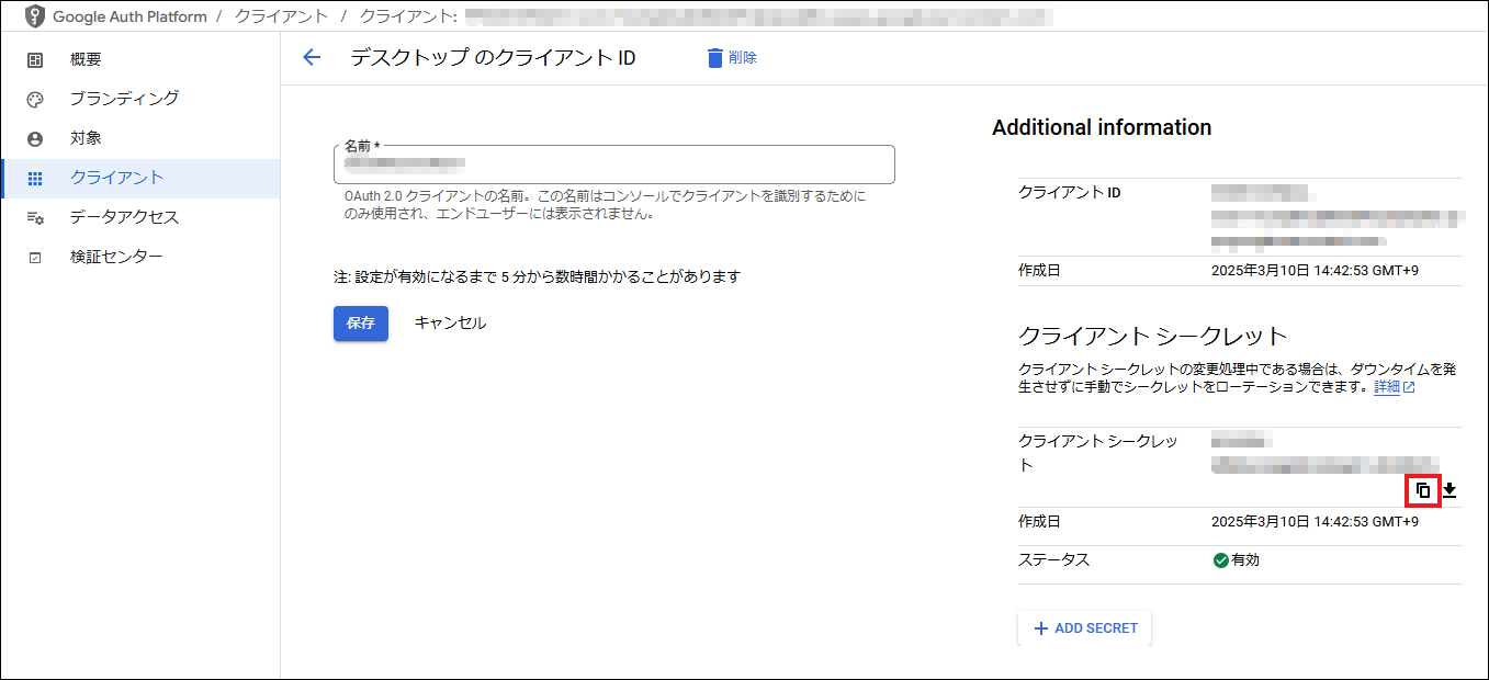 4.2. 管理者用ウェブサイトでのクライアントIDおよびクライアントシークレットの設定¶
