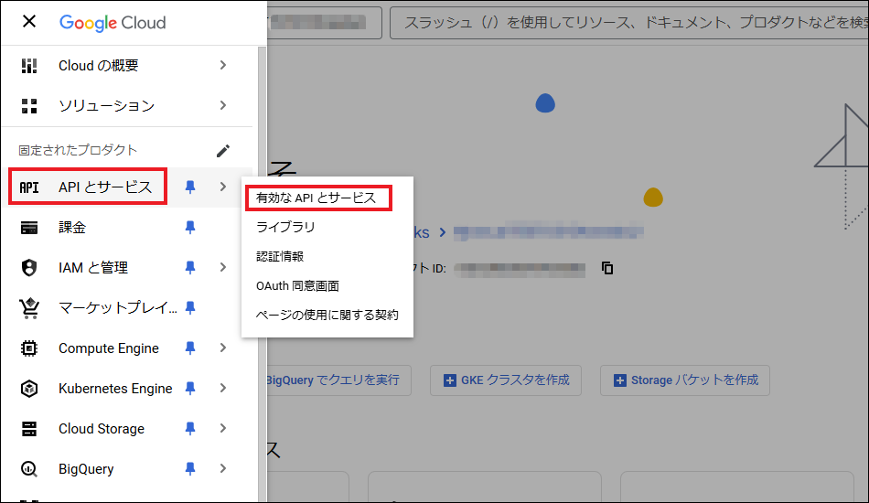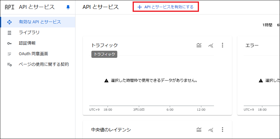 a). 画面左上のメニューアイコンをクリックしてサイドメニューを表示し、[APIとサービス]>[有効なAPIとサービス]をクリックします。