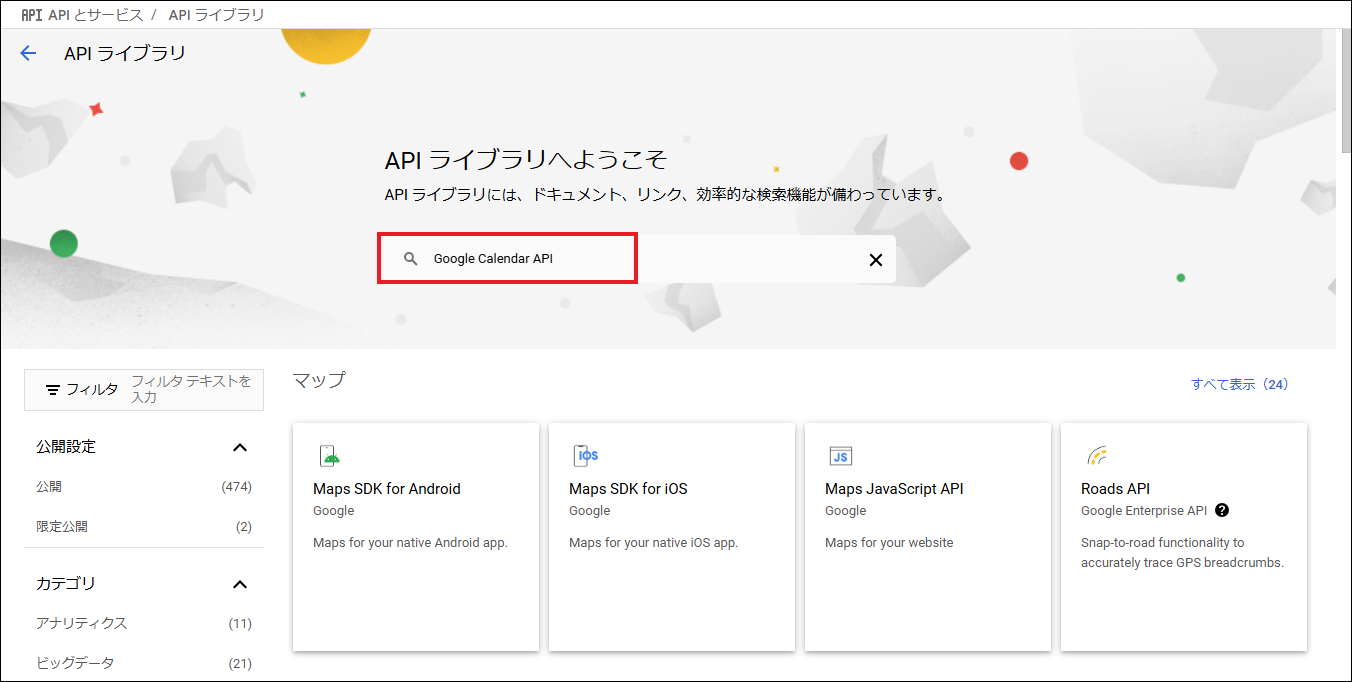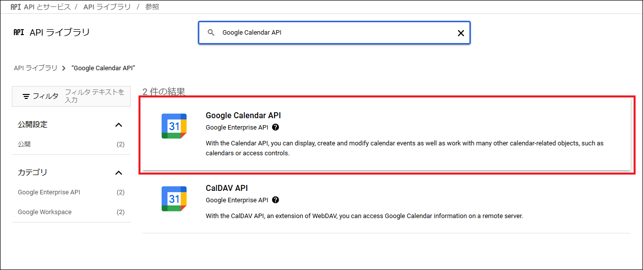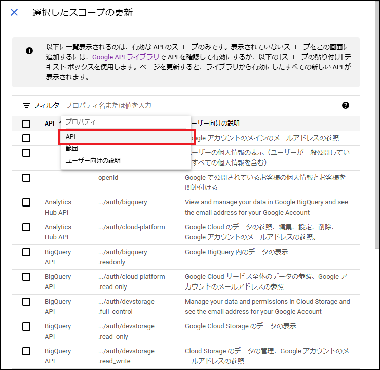 b). フィルタの入力欄をクリックしてプルダウンメニューを表示し、「API」をクリックします。