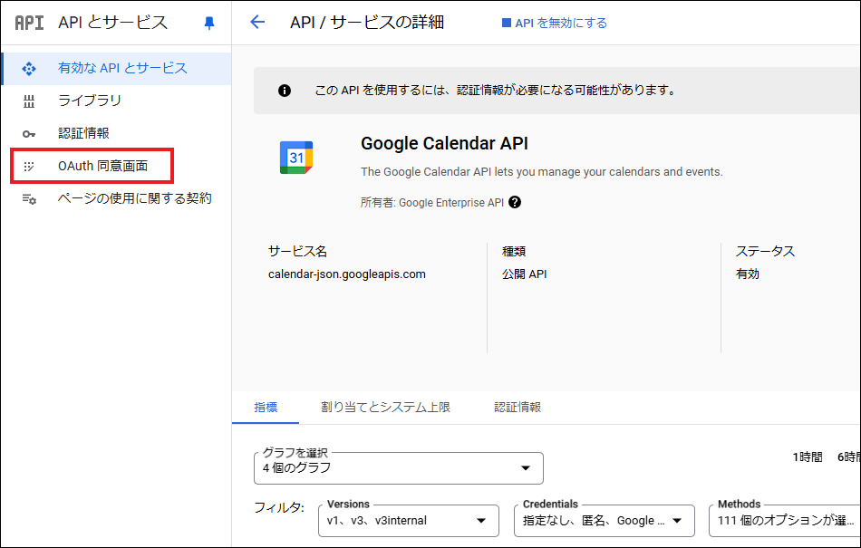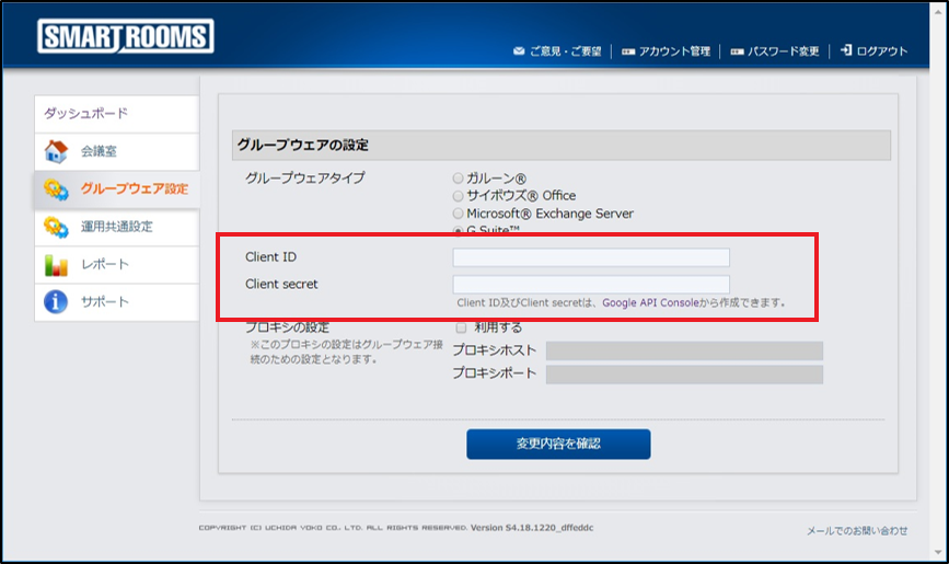 項目 設定値 アプリ名 SmartRooms(任意) ユーザーサポートメール 管理者アカウントのメールアドレス 連絡先情報 任意のメールアドレス a). サイドメニューから[OAuth同意画面]をクリックします。