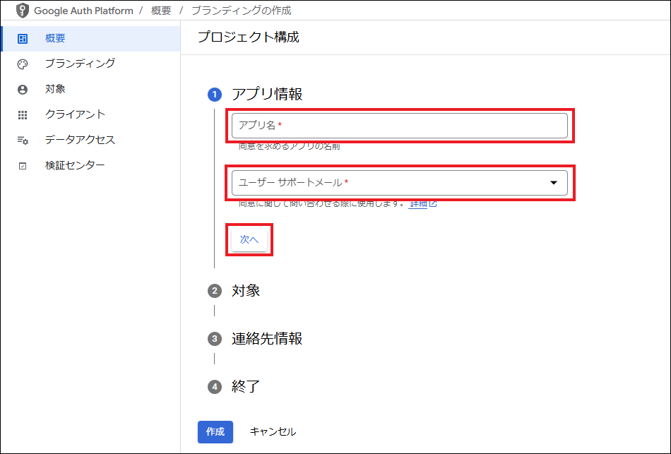 - c). ①「アプリ情報」の「アプリ名」と「ユーザーサポートメール」を入力します。