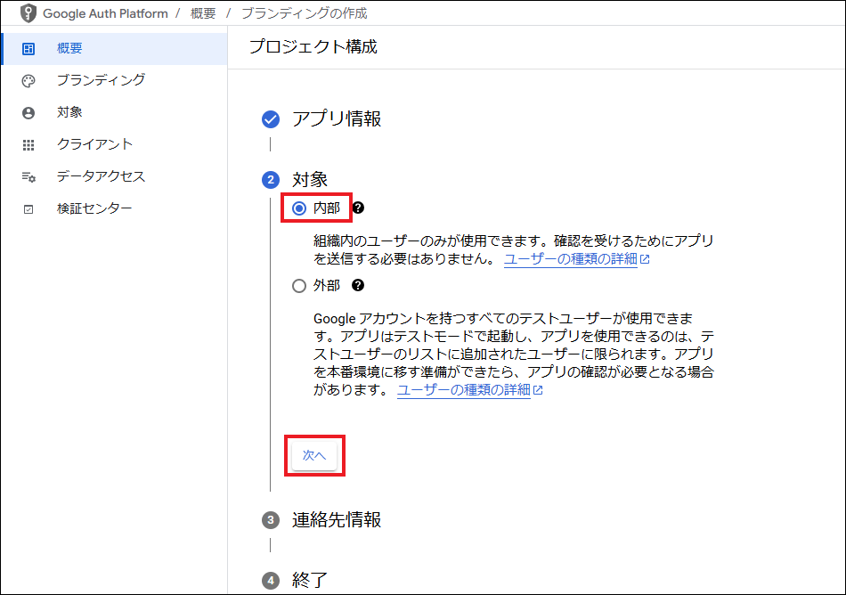 - d). ②の「対象」で「内部」のラジオボタンをオンにします。