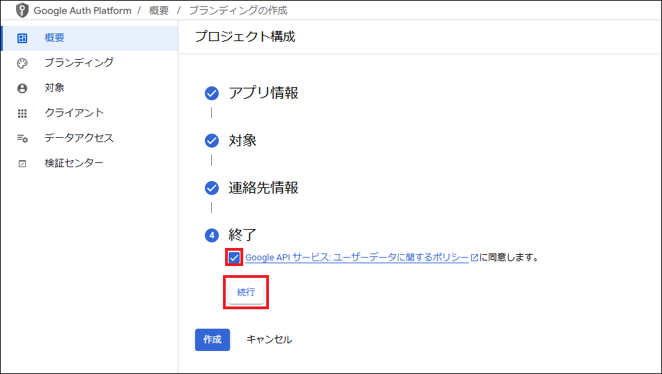 - f). ④の「終了」の「Google APIサービス:ユーザーデータに関するポリシーに同意します」のリンク先を参照し、チェックを入れます。