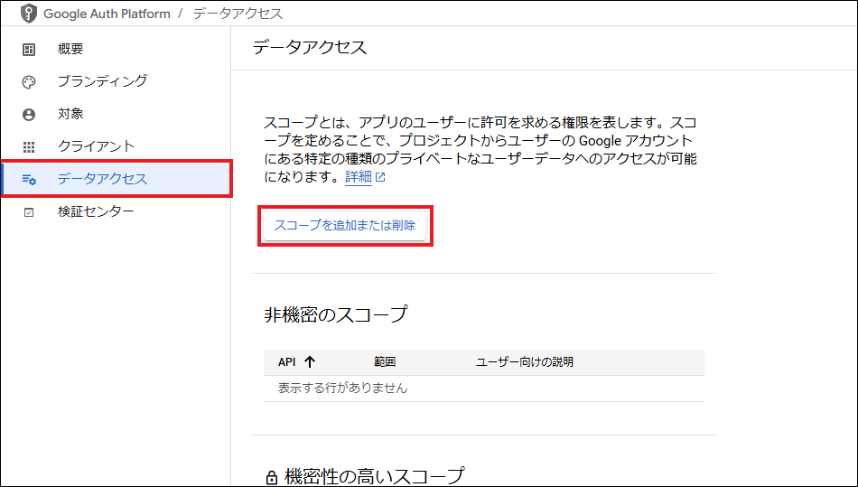a). サイドメニューの[データアクセス]をクリックし、[スコープを追加または削除]をクリックします