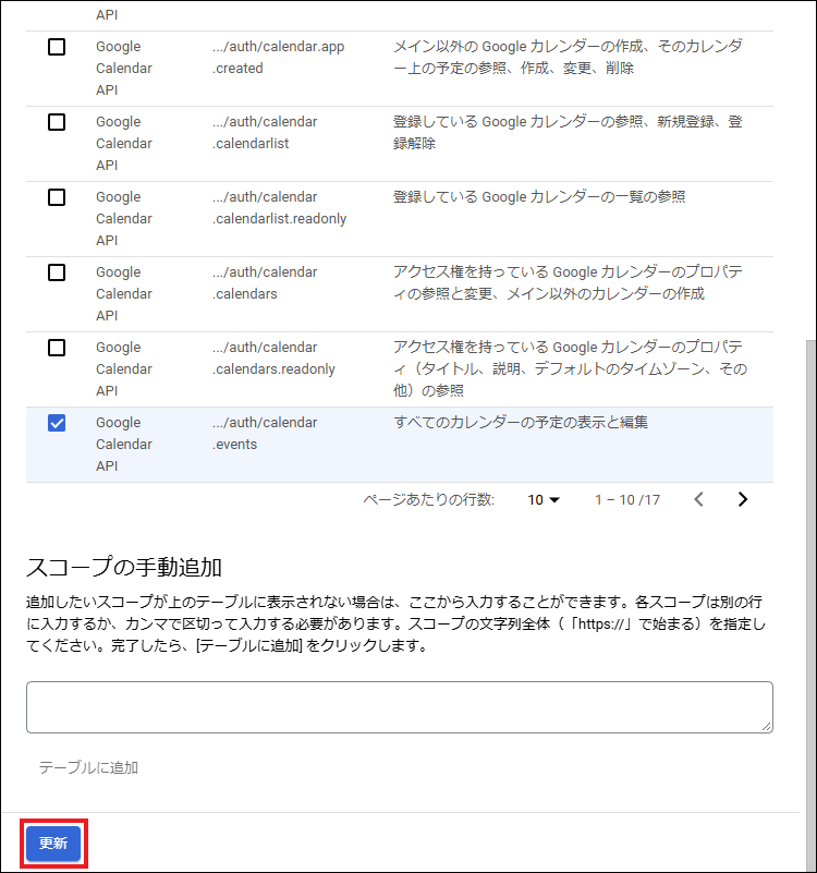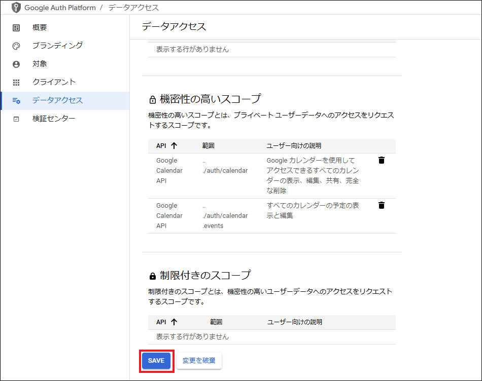 e). 画面下へスクロールして「機密性の高いスコープ」に追加したAPIがあることを確認し、画面最下端の[SAVE]をクリックします。