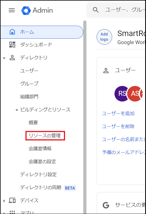 既存の会議室リソースを利用する場合は「SmartRooms用アカウントの作成」に進んでください。