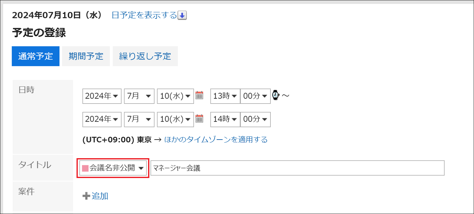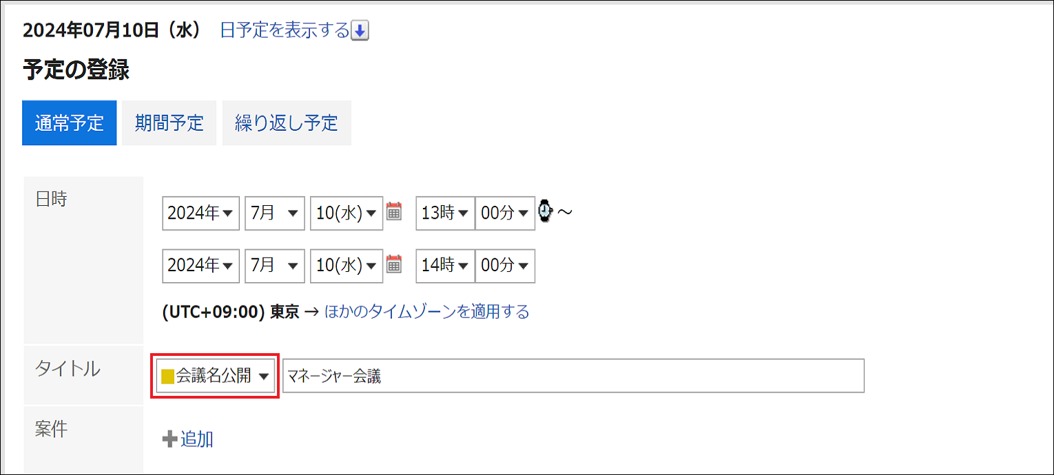 会議タイトル表示用の特定のキーワードと、非表示用の特定のキーワードをGaroonの「予定メニュー」に登録します。