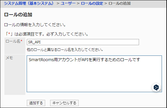 Garoonシステム管理のロール設定で、ロールを追加し、SmartRooms用アカウントを設定します。