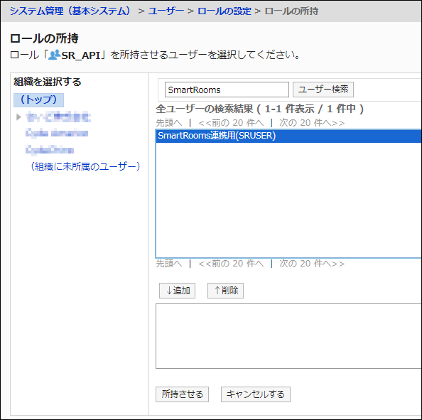 「ロールの所持」画面が表示されるので、SmartRooms用アカウントをユーザー検索します。
