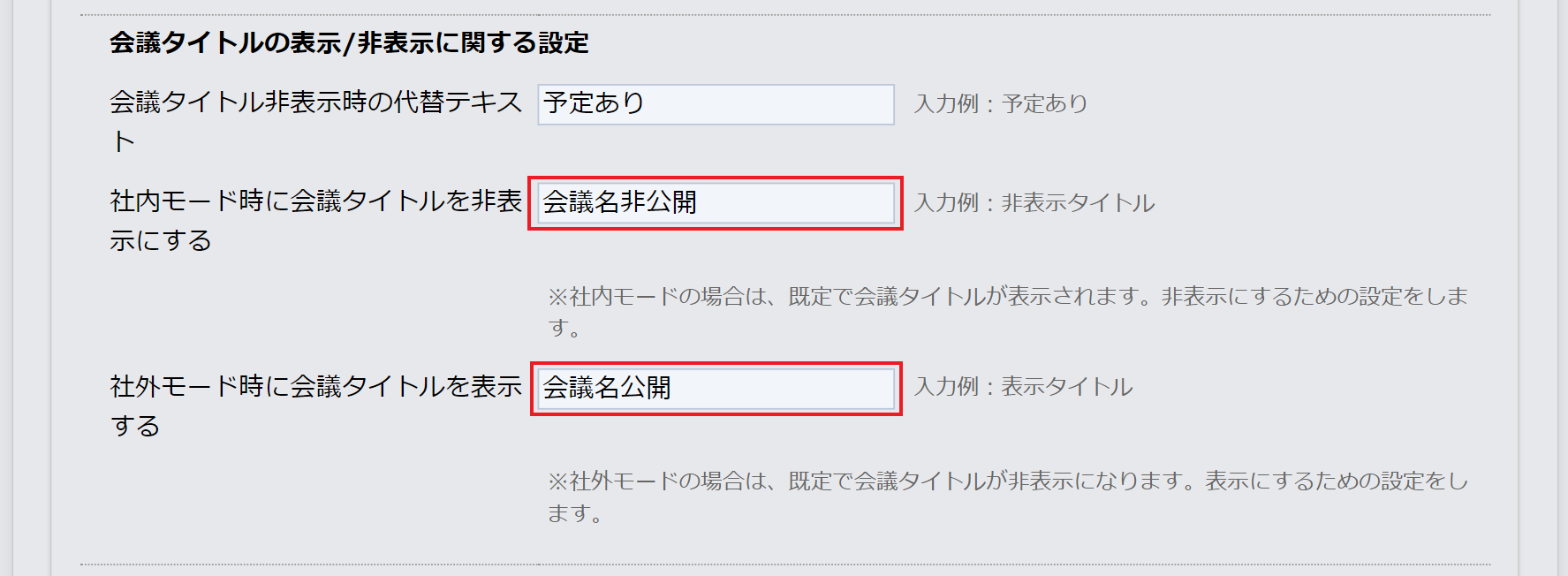 - 「会議タイトルの表示/非表示に関する設定」で、「社内モード時に会議タイトルを非表示にする」と「社外モード時に会議タイトルを表示する」を設定します。