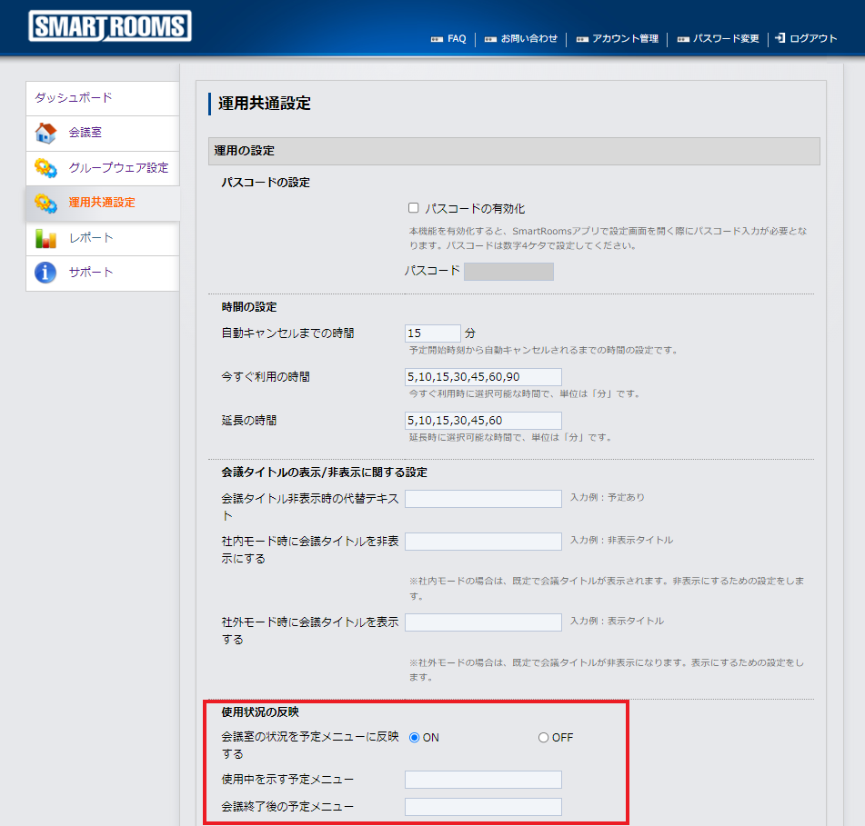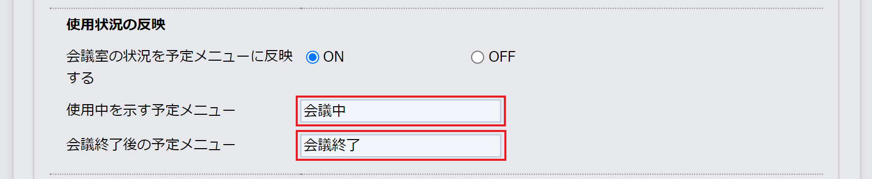 「使用状況の反映」の「会議室の状況を予定メニューに反映する」をONにします。