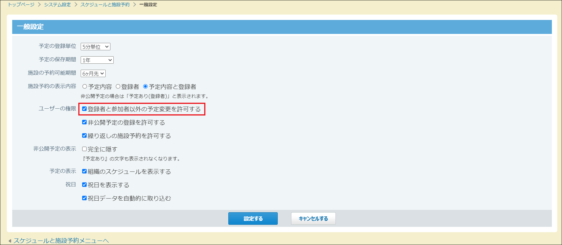 「ユーザーの権限」の「登録者と参加者以外の予定変更を許可する」にチェックを入れます。