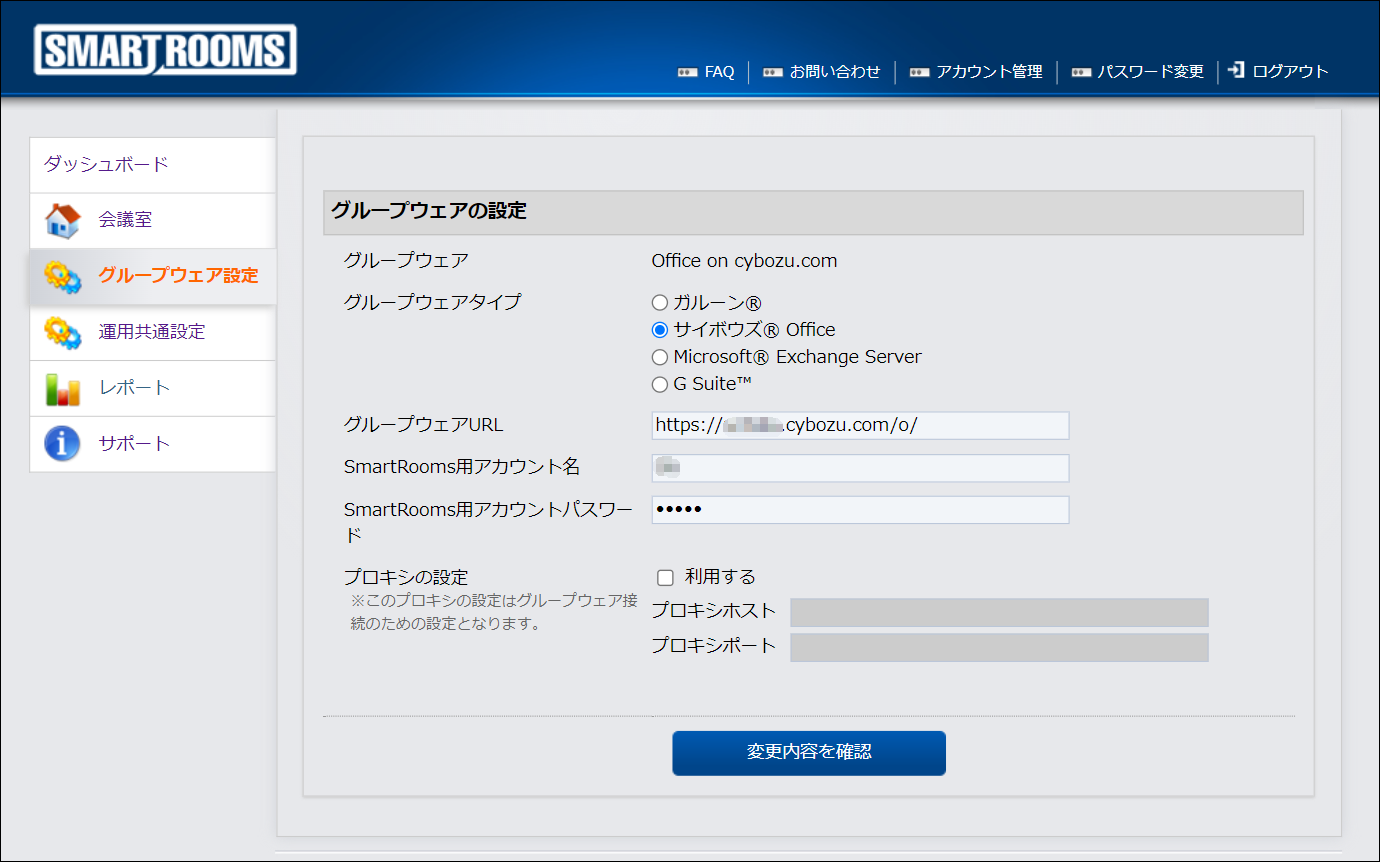 SmartRooms用アカウントはAPI接続を行うため、アカウントごとではなくサイボウズ Office全体のパスワード有効期限が適用されます。パスワードの有効期限が切れた場合、各端末からグループウェアに接続ができません。サイボウズ Officeのシステム管理からパスワードの再設定を行ってください。SmartRooms用アカウントのパスワード変更を実施した後に、「 グループウェア設定への保存 」を実施します。
