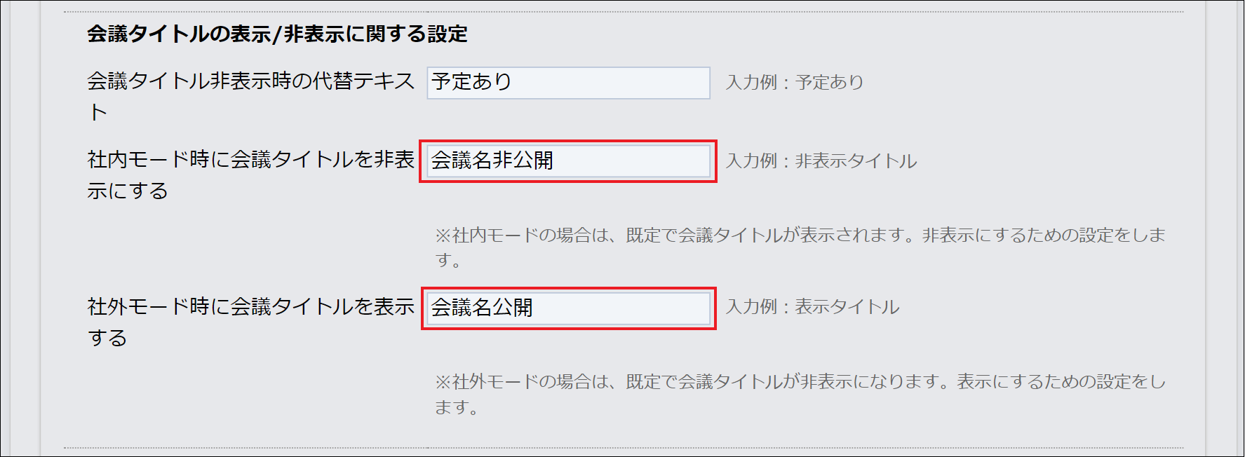 - 「会議タイトルの表示/非表示に関する設定」で、「社内モード時に会議タイトルを非表示にする」と「社外モード時に会議タイトルを表示する」を設定します。