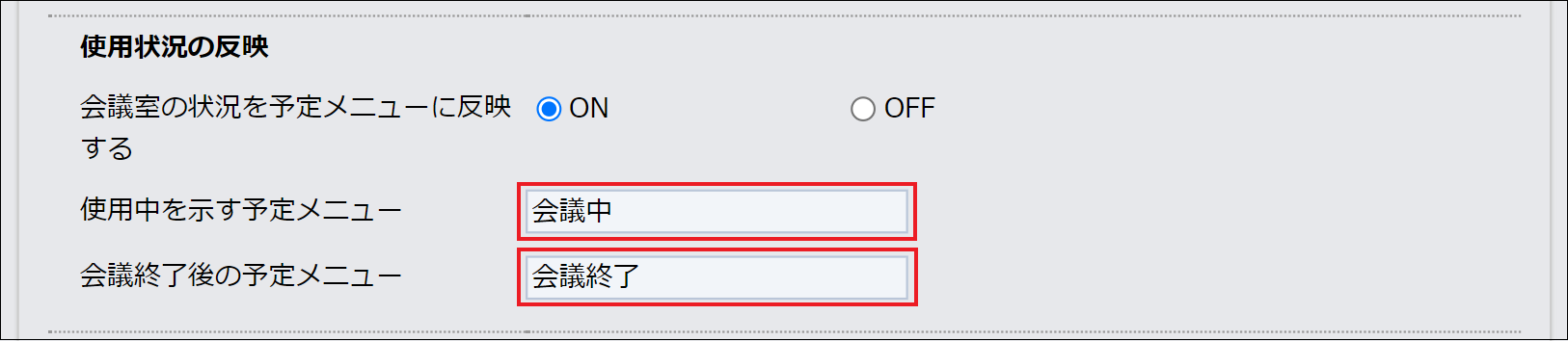 「使用状況の反映」の「会議室の状況を予定メニューに反映する」をONにします。