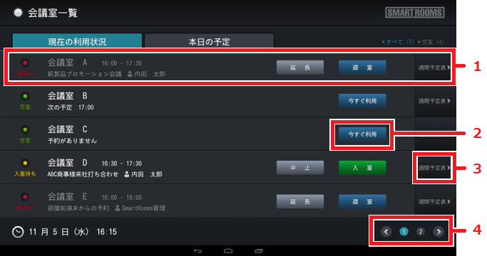 「本日の予定」タブでは、当日の各会議室の予定が確認できます。