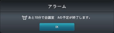 「会議終了アラーム」機能がONに設定されている、かつ、アラーム音が設定されている会議室では、会議の予定終了時刻から一定時間前にアラーム音が3秒鳴ります。