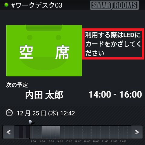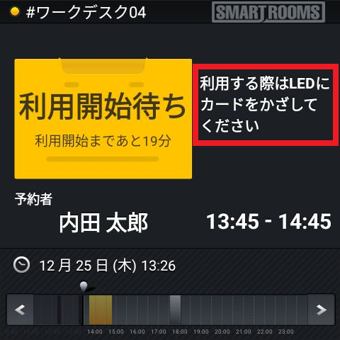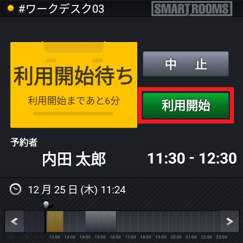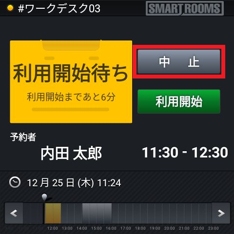 - メイン画面は予定終了時刻まで「利用開始待ち」と表示され、自動キャンセルは実行されません。予定終了時刻になると予約は自動的に終了し「空席」または次の予約が表示されます。