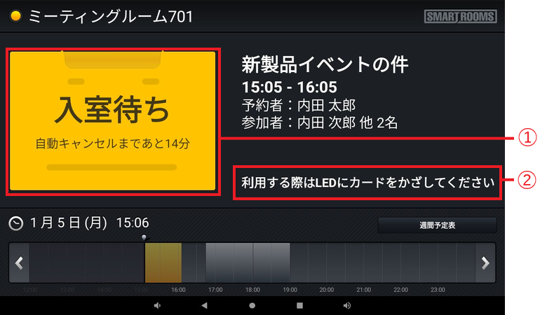 予定開始時刻から一定時間経過しても「入室」ボタンがタップされない場合、自動キャンセルが実行され空室状態になります。自動キャンセルまでの時間は、管理者によって設定されています。