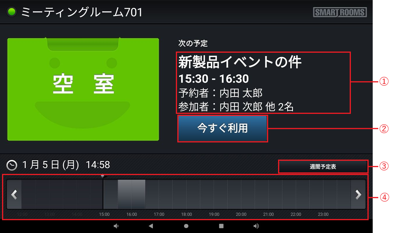 会議室が空いている場合は、以下のような「メイン画面」が表示されます。