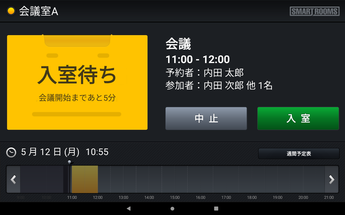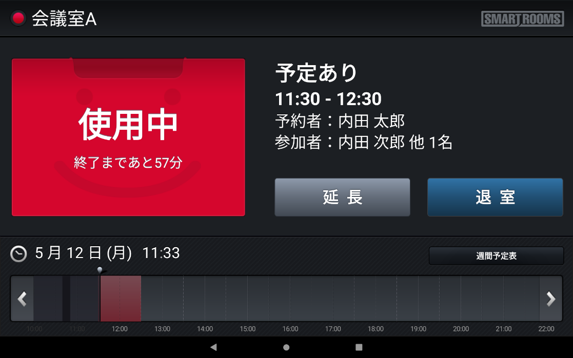 「社内モード」は、内部用の会議室などに設定し、グループウェアで予約した会議タイトルがそのまま表示されます。