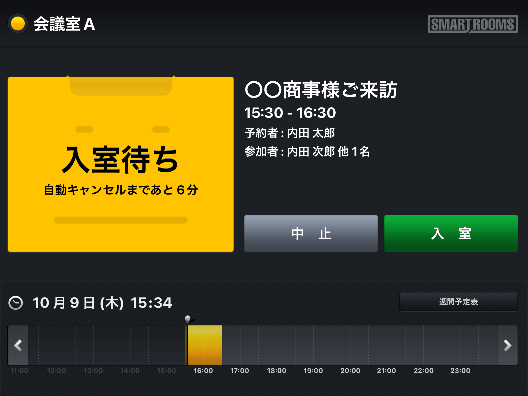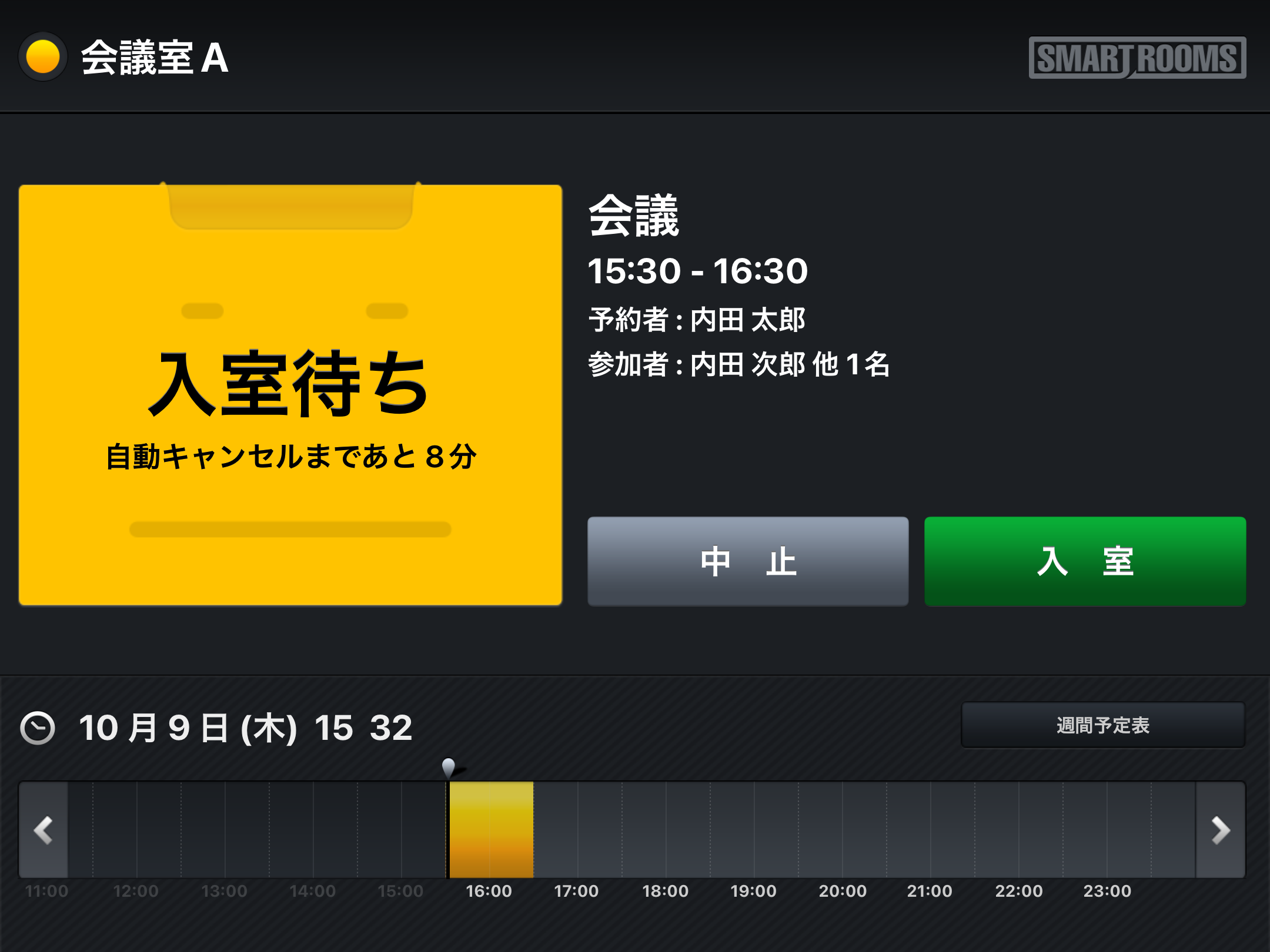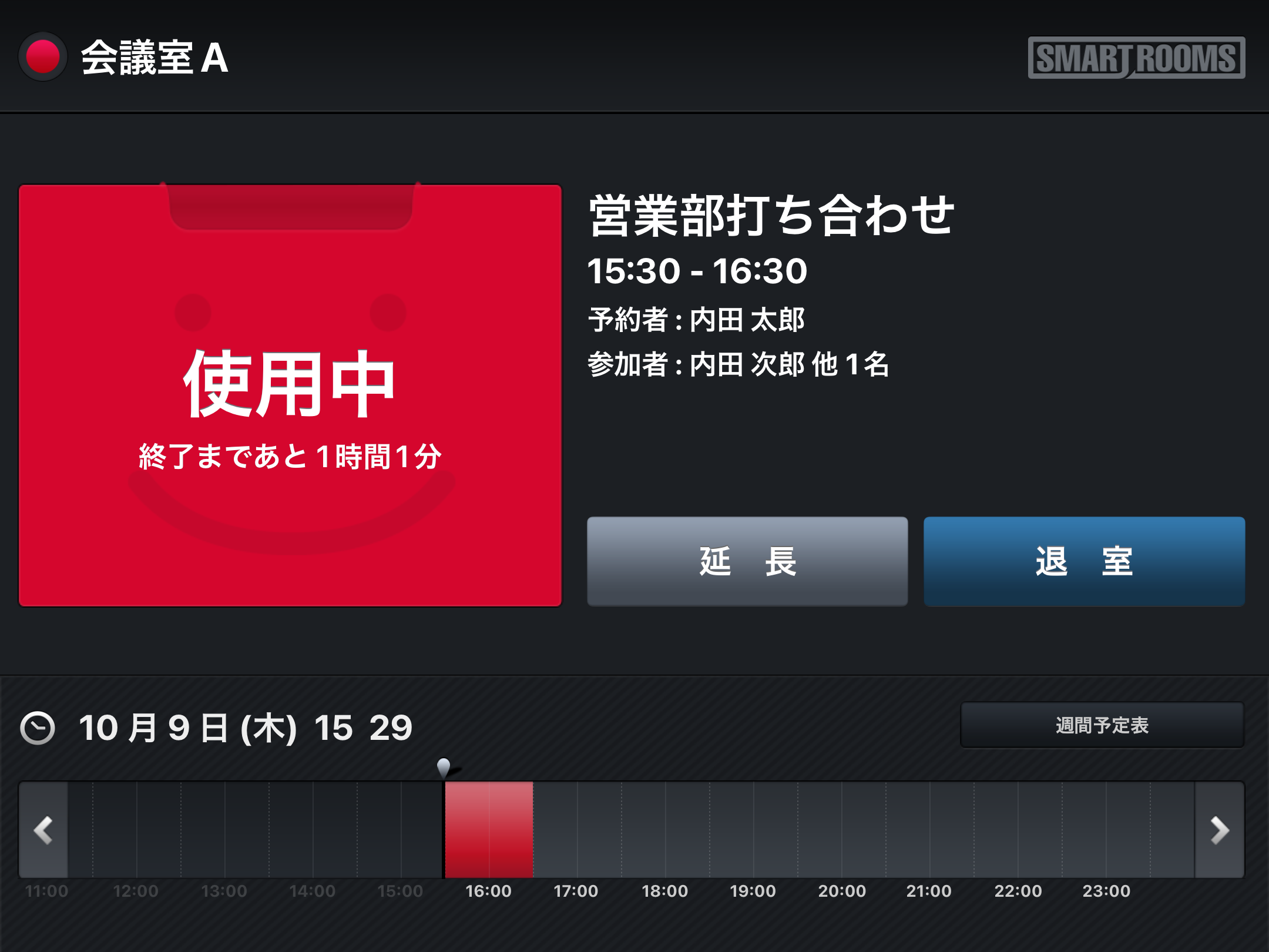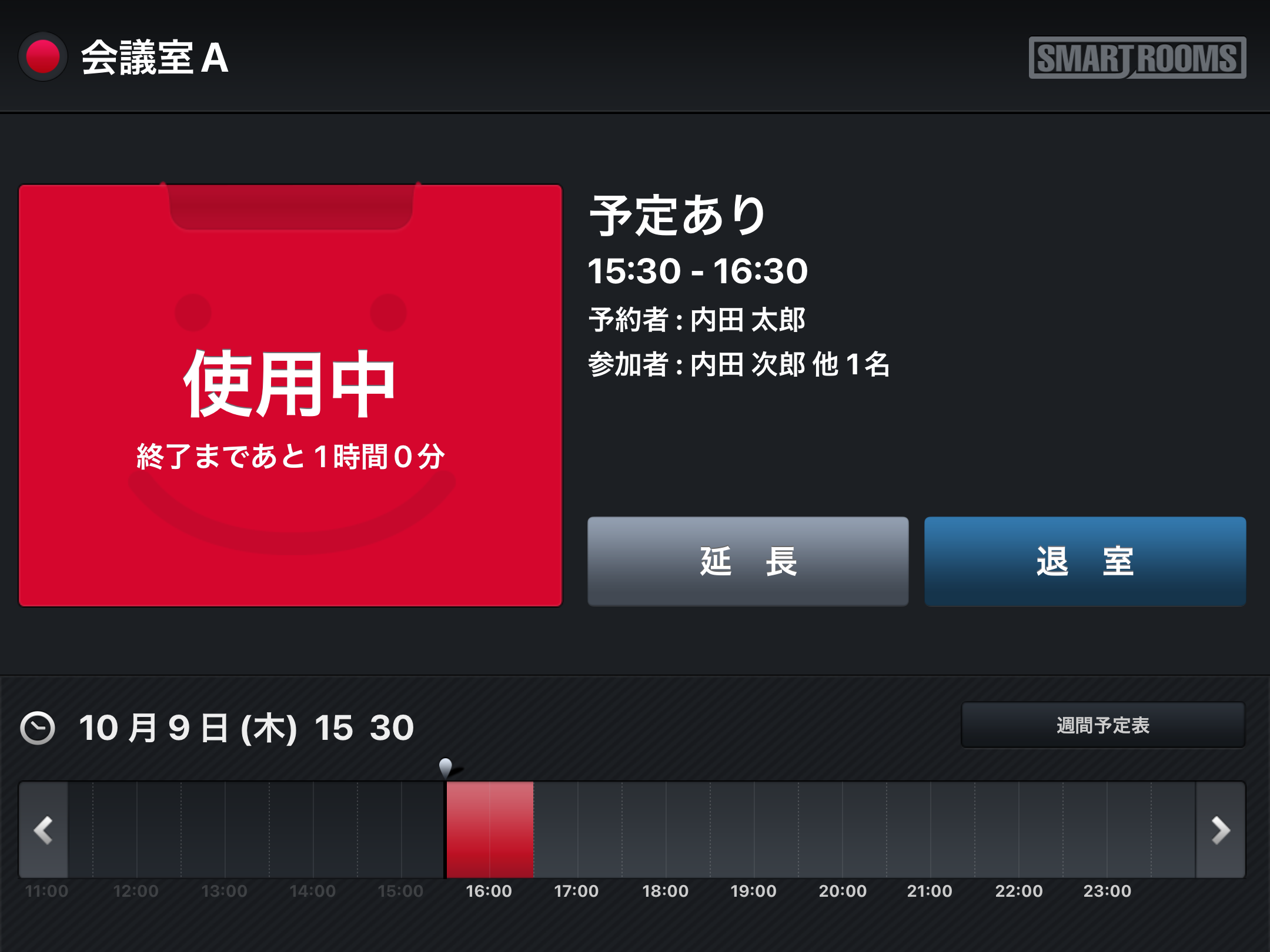 「社内モード」は、内部用の会議室などに設定し、グループウェアで予約した会議タイトルがそのまま表示されます。
