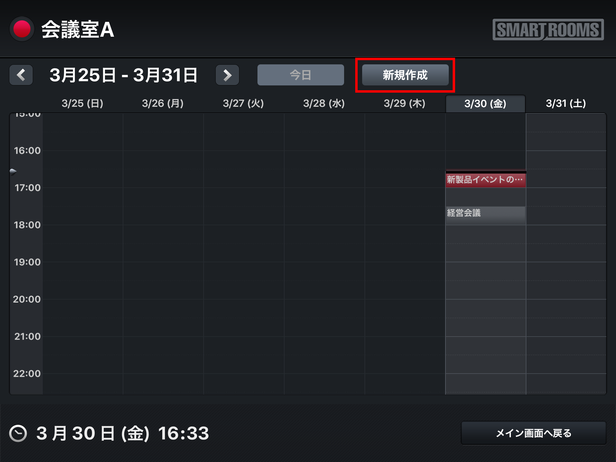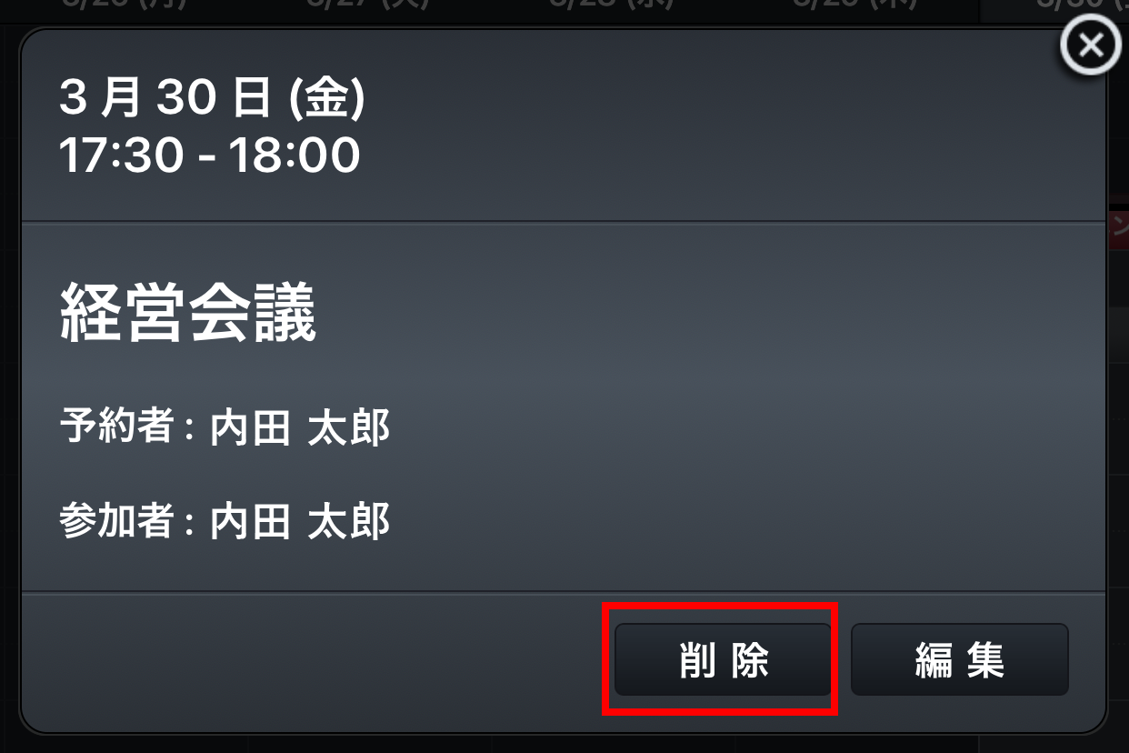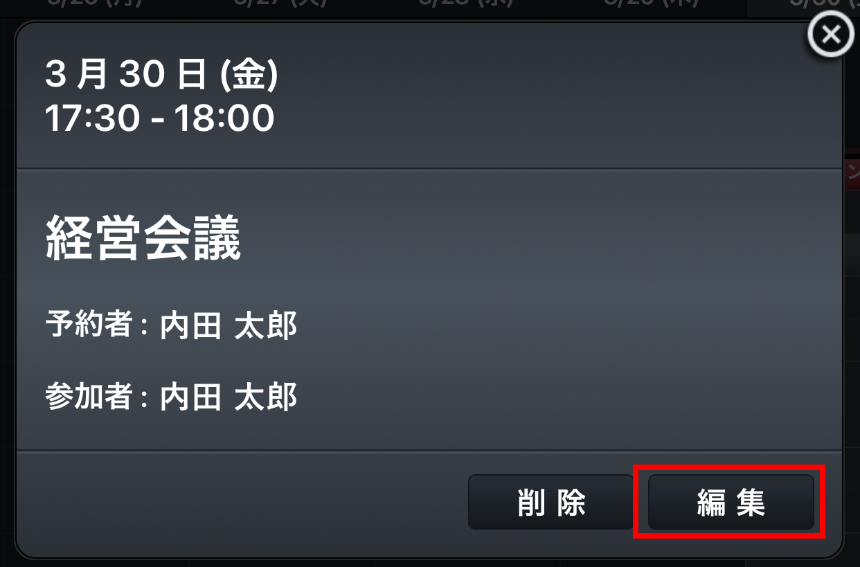 管理者の設定により、「予約/編集/削除ボタンの表示」がOFFになっている場合があります。その場合は、タイムバーや週間予定表をタップしても新規予約のダイアログおよび「新規作成」ボタンは表示されません。また、該当の予定をタップして表示される予約情報画面には「削除」と「編集」ボタンは表示されません。