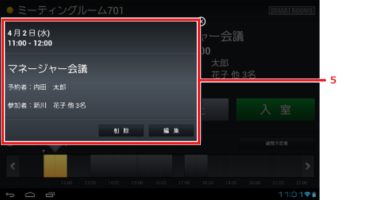 - タップすると予約を中止します。中止された予約は会議室の予定表から削除されます。