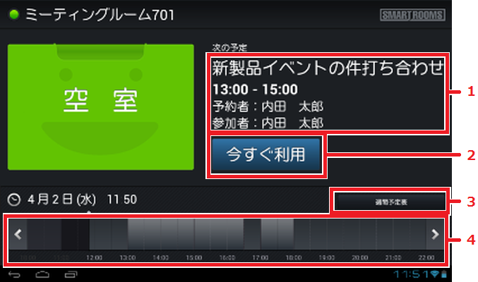 - 会議室の利用を終了し、次の予定を表示または空室状態に遷移します。