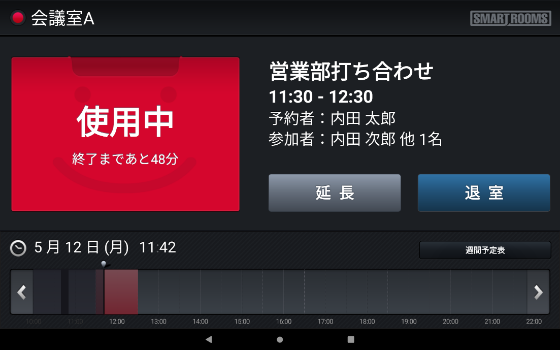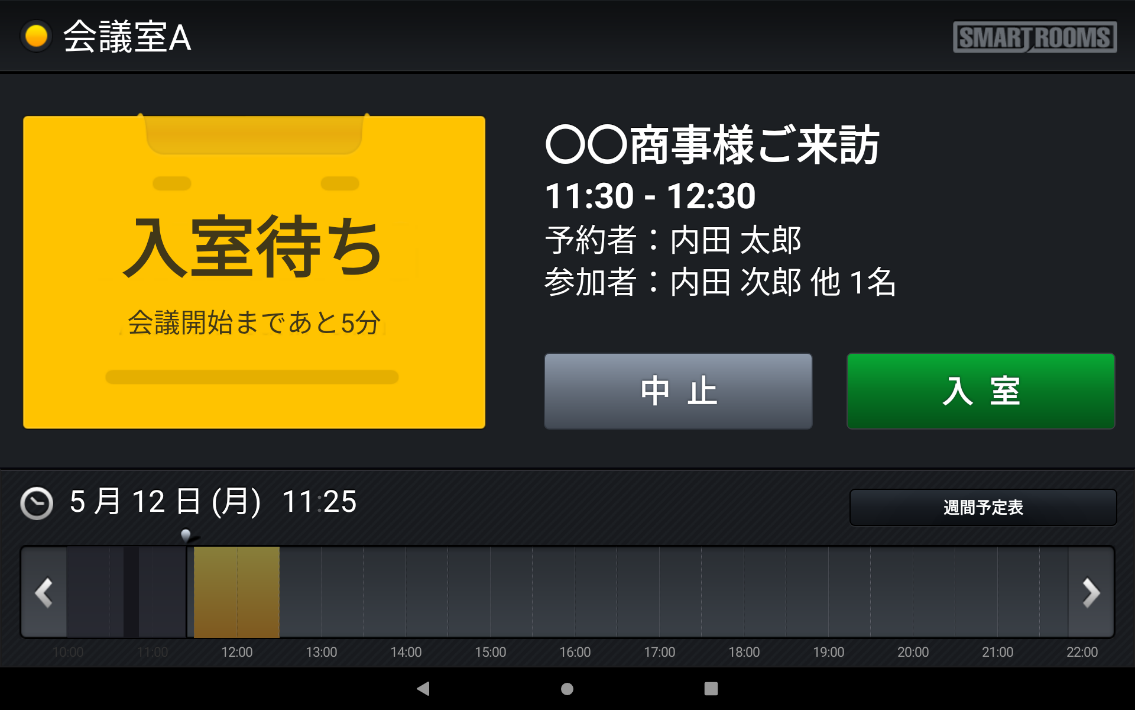 「社内モード」は、内部用の会議室などに設定し、グループウェアで予約した会議タイトルがそのまま表示されます。