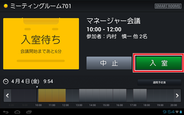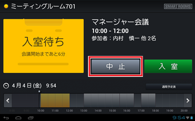 - 自動キャンセルは実行されないため、メイン画面は入室待ちのままとなります。「入室」ボタンをタップしなかった場合、予定終了時刻になると予定は自動終了し、空室状態になります。