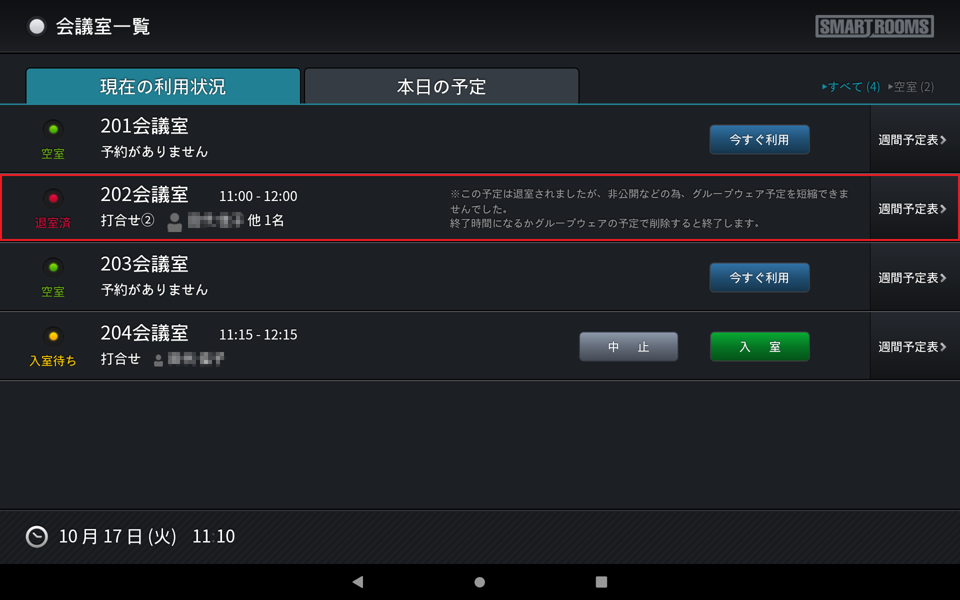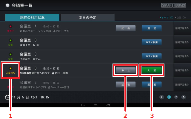 「現在の利用状況」タブでは、各会議室の状態の確認や入退室などの操作ができます。